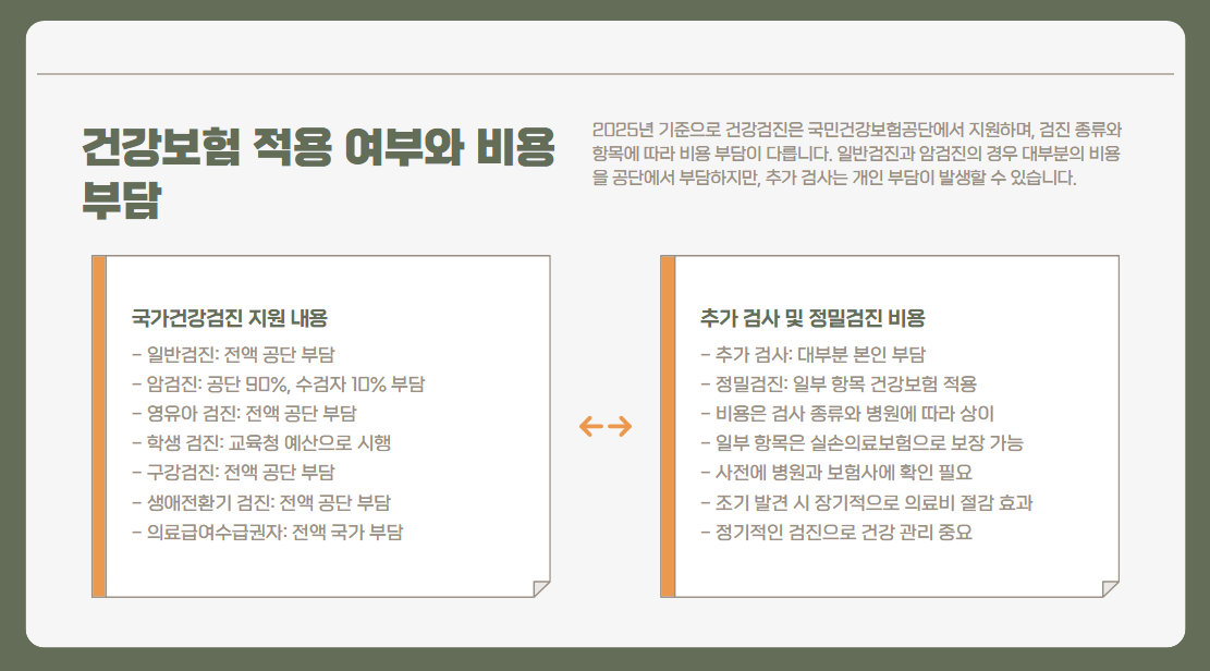 2025년 기준으로 건강검진은 국민건강보험공단에서 지원하며, 일반검진은 전액 공단 부담입니다. 암검진의 경우 공단이 90%, 수검자가 10%를 부담합니다. 추가 검사나 정밀검진은 일부 항목에 대해 건강보험이 적용되며, 적용 여부와 본인 부담금은 검사 종류와 병원에 따라 다릅니다.