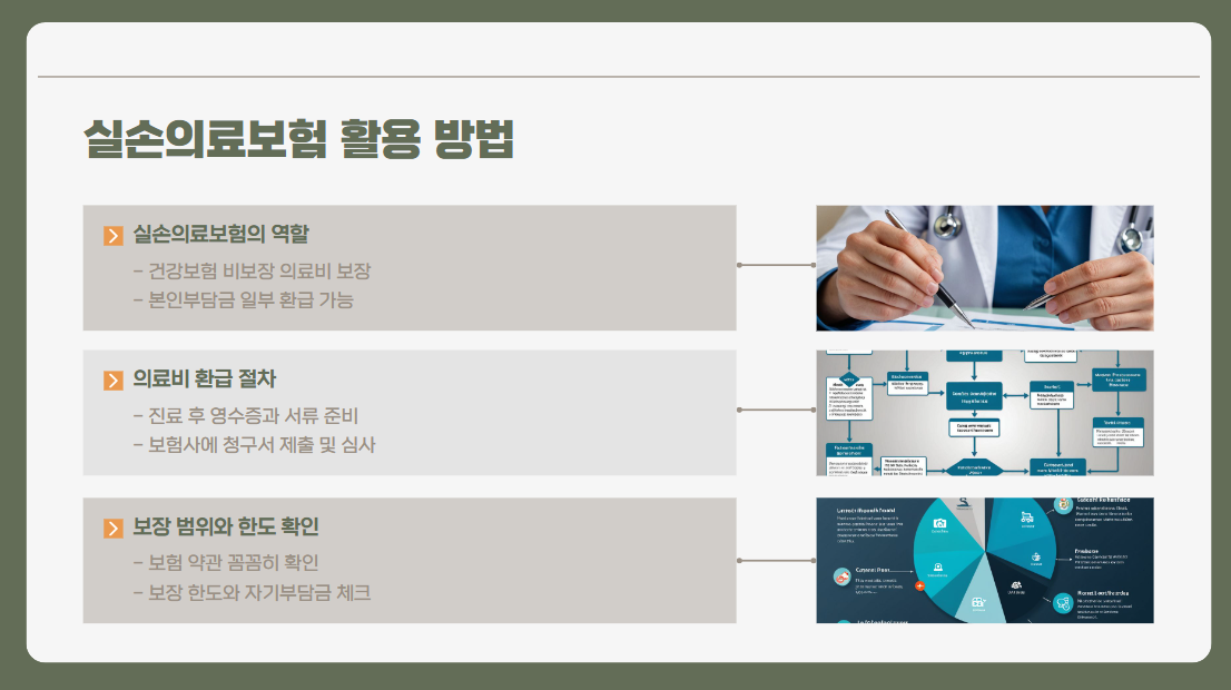 - A3: 건강보험으로 보장되지 않는 본인 부담 의료비를 실손의료보험으로 환급받을 수 있습니다. 다만, 보험 상품에 따라 보장 범위와 한도가 다르므로 약관을 확인하세요.