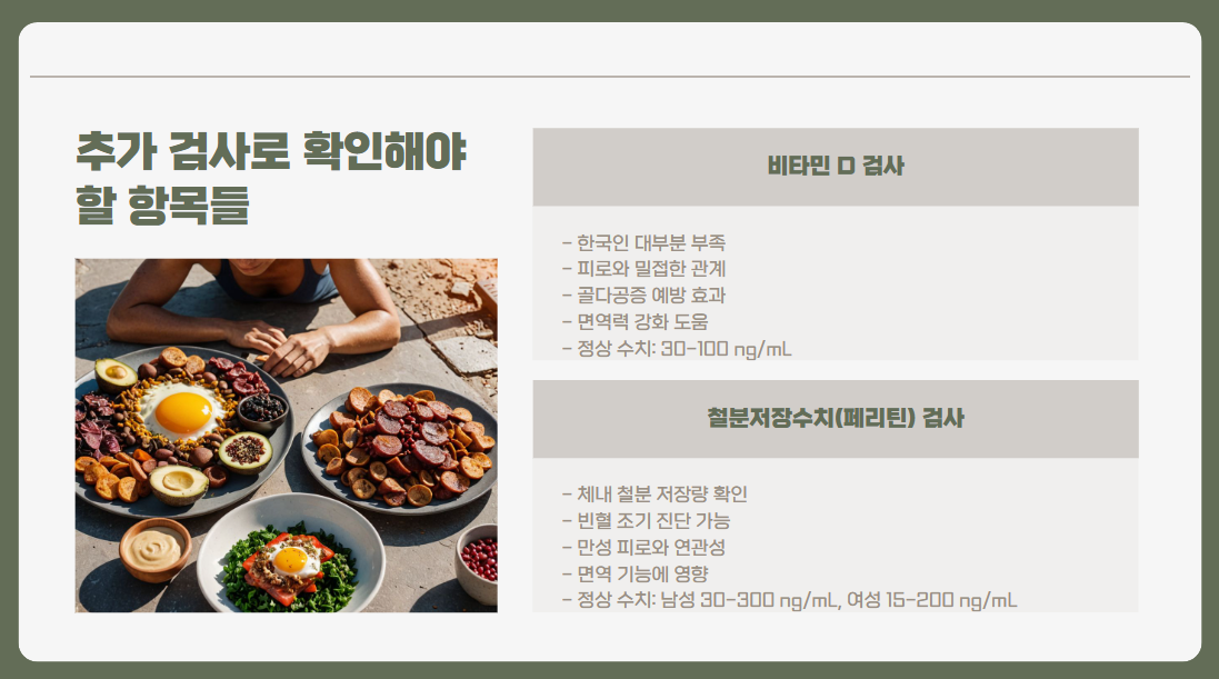 기본 건강검진에서 놓칠 수 있는 피로의 원인들을 확인하기 위해 추가로 검사할 수 있는 항목들이 있습니다. 만약 여러분이 지속적인 피로에 시달리고 있다면, 아래 항목들을 꼭 확인해 보세요.
