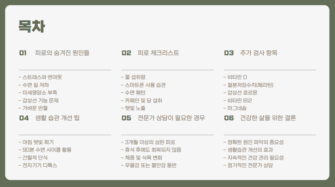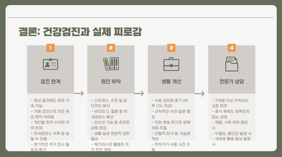 건강검진 결과가 정상이라고 해서 모든 피로가 해결되는 것은 아닙니다. 피로의 원인을 정확히 파악하고, 필요시 추가 검사나 생활습관 개선을 통해 에너지를 회복하는 것이 중요합니다. 여러분도 오늘부터 조금씩 생활 습관을 개선해 보세요. 작은 변화가 큰 차이를 만들 수 있습니다! 여러분의 건강을 응원합니다! 💪